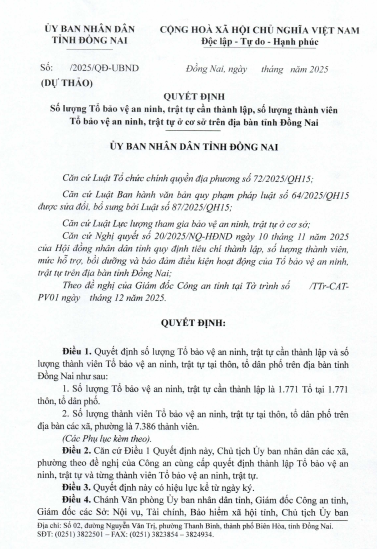 dự thảo Quyết định của UBND tỉnh về số lượng Tổ bảo vệ ANTT cần thành lập, số lượng thành viên Tổ bảo vệ ANTT ở cơ sở trên địa bàn tỉnh Đồng Nai