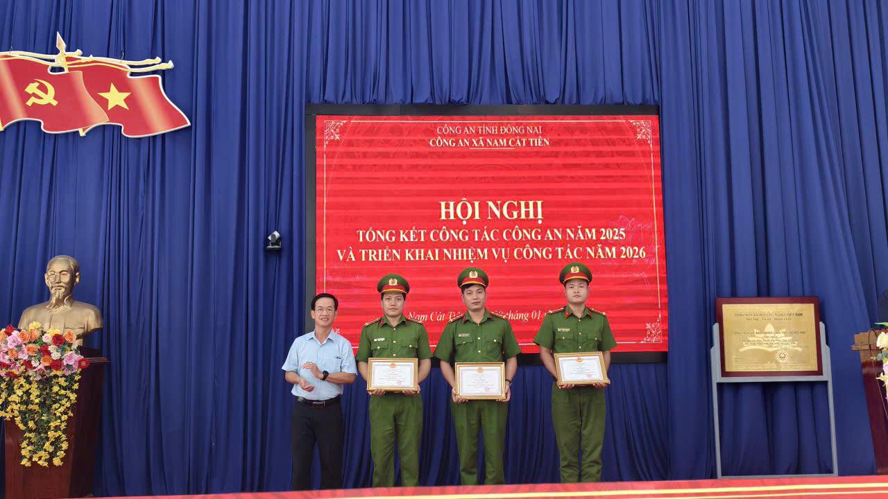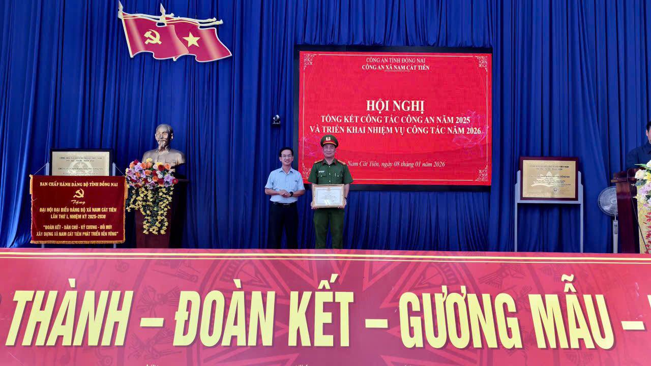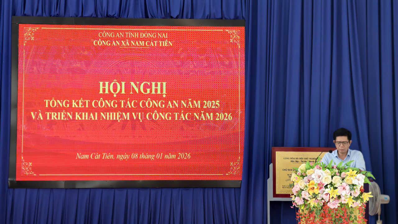 Chiều ngày 08/01/2026, Công an xã Nam Cát Tiên long trọng tổ chức Hội nghị tổng kết công tác Công an và phong trào thi đua “Vì an ninh Tổ quốc” năm 2025; đồng thời triển khai nhiệm vụ công tác Công an và phát động phong trào thi đua năm 2026.