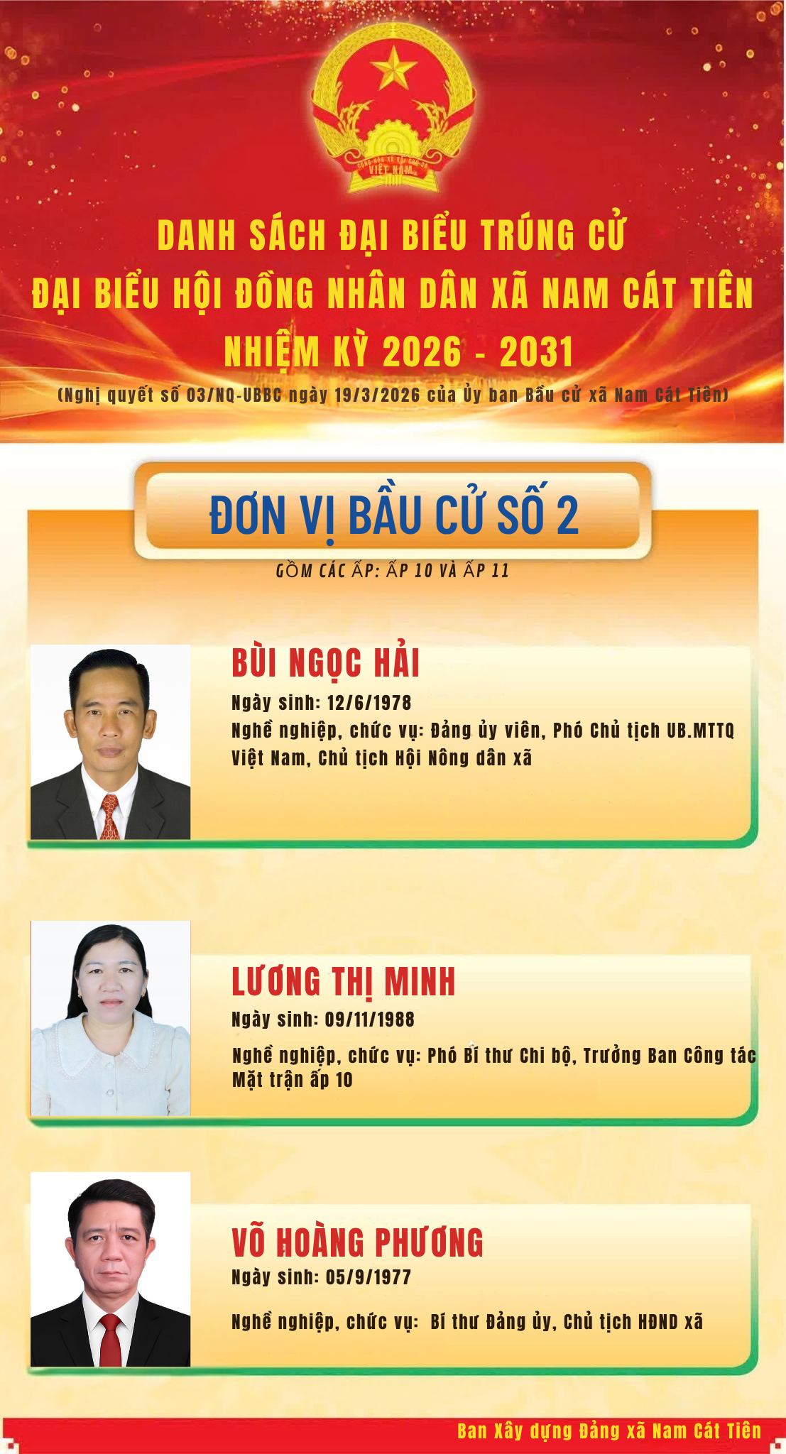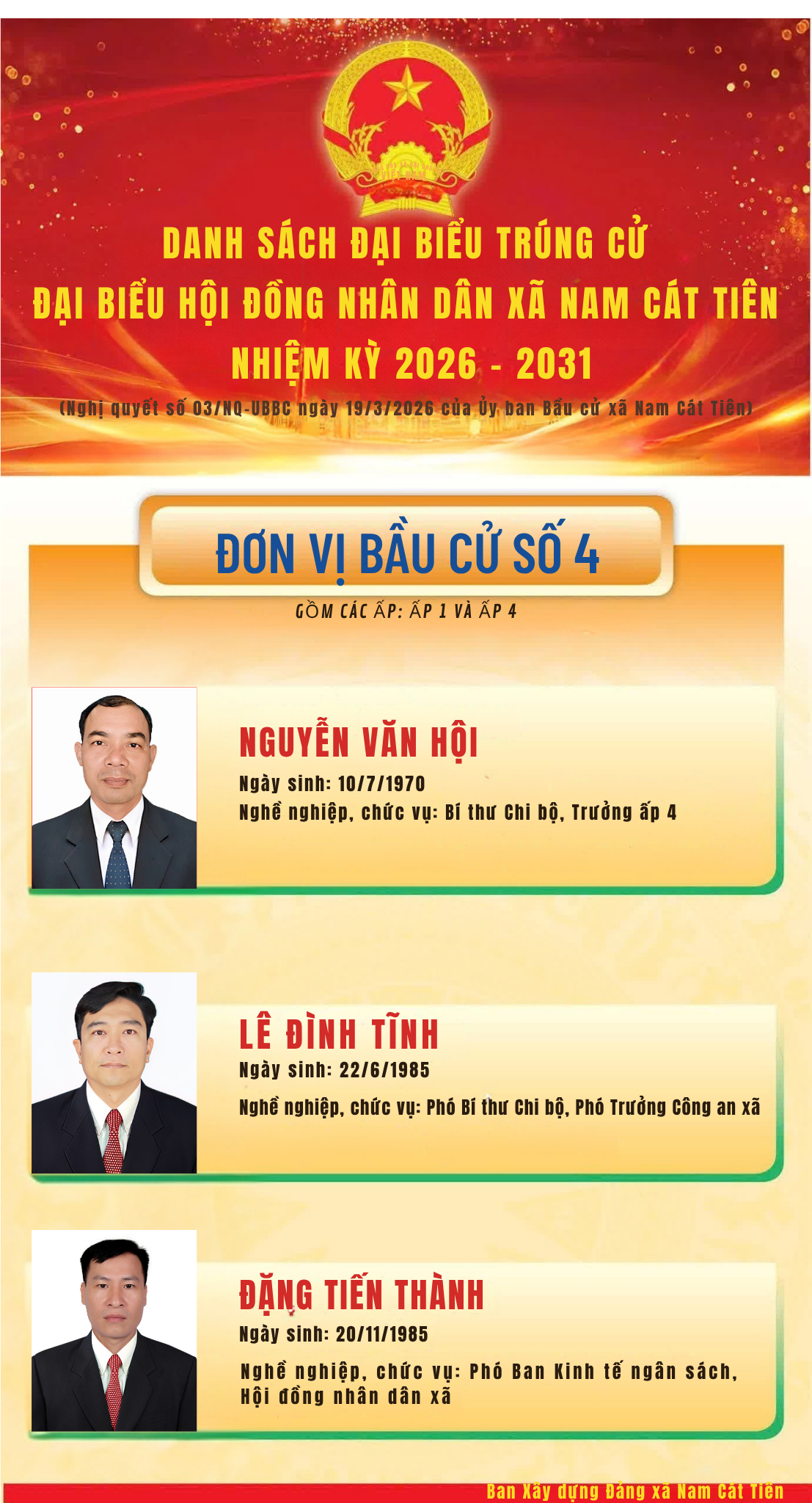 Nghị quyết số 03/NQ-UBBC ngày 19/3/2026 của Ủy ban Bầu cử xã Nam Cát Tiên Công bố kết quả bầu cử và danh sách 17 người trúng cử Đại biểu Hội đồng nhân dân xã Nam Cát Tiên, nhiệm kỳ 2026 – 2031 đã chính thức được công bố. Đây là kết quả của tinh thần dân chủ, đoàn kết, trách nhiệm và sự đồng thuận cao của toàn thể cử tri, Nhân dân trên địa bàn xã trong đợt bầu cử vừa qua.