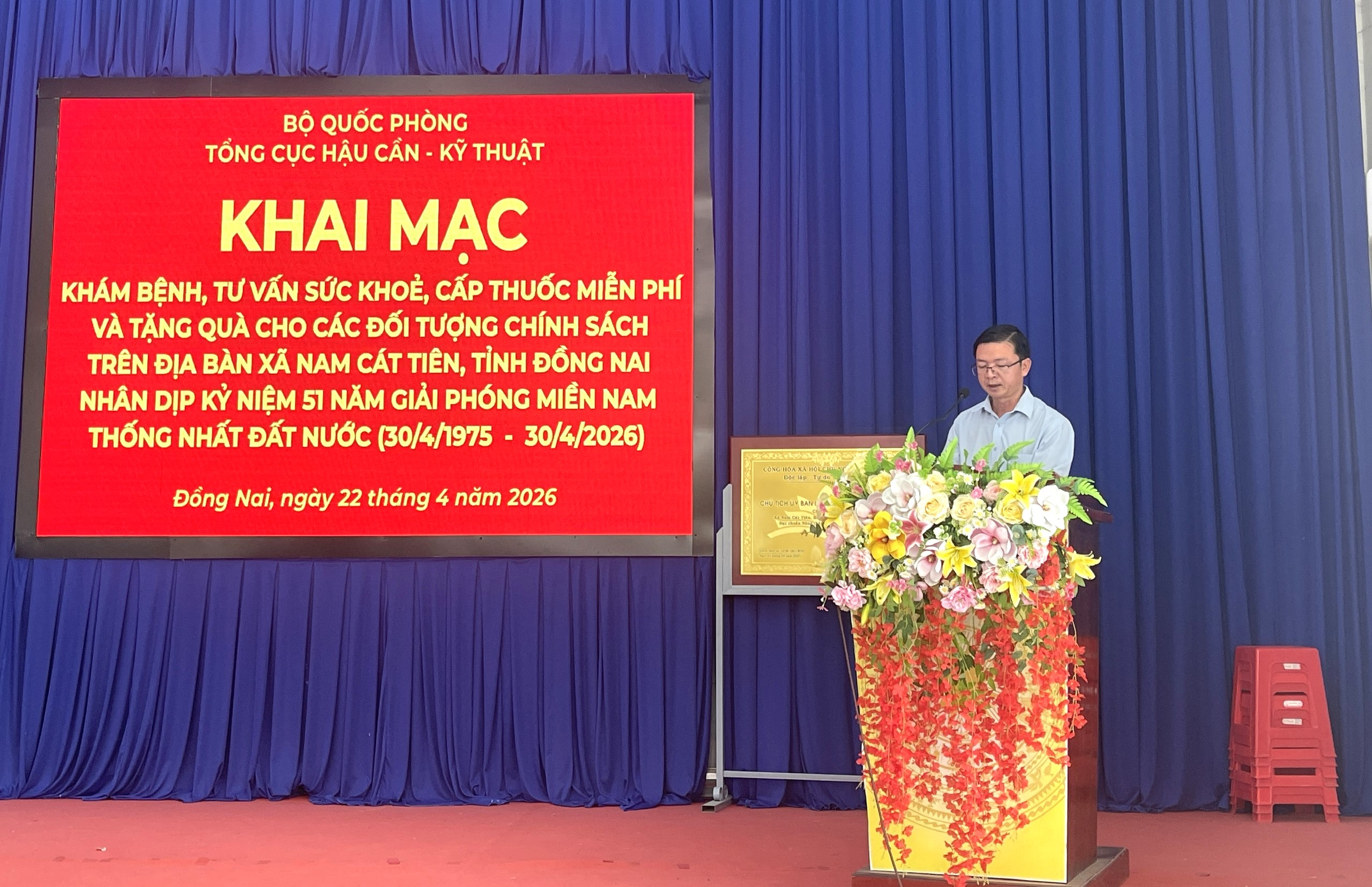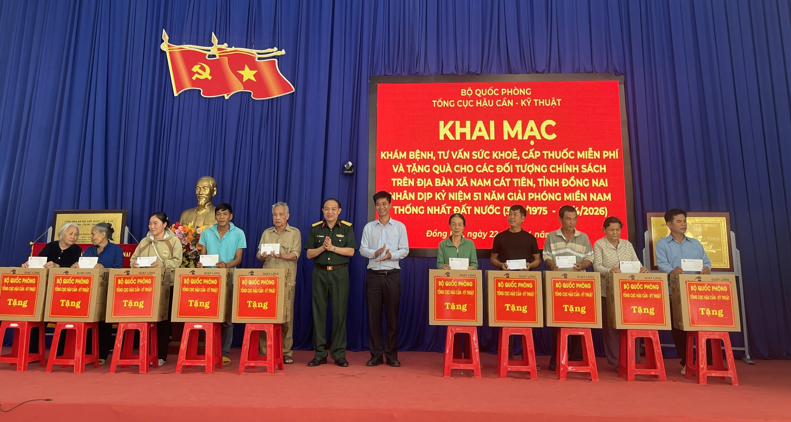 Hướng tới kỷ niệm 51 năm Ngày Giải phóng miền Nam, thống nhất đất nước (30/4/1975 – 30/4/2026) và Ngày Quốc tế Lao động 01/5, sáng ngày 22/4/2026, tại xã Nam Cát Tiên đã diễn ra chương trình “Khám bệnh, tư vấn sức khỏe, cấp phát thuốc miễn phí và tặng quà cho các đối tượng chính sách, hộ nghèo có hoàn cảnh khó khăn”. Đây là hoạt động ý nghĩa, thiết thực nhằm chăm lo sức khỏe Nhân dân, đồng thời phát huy truyền thống “Uống nước nhớ nguồn”, tăng cường mối quan hệ gắn bó giữa lực lượng vũ trang và Nhân dân địa phương.
