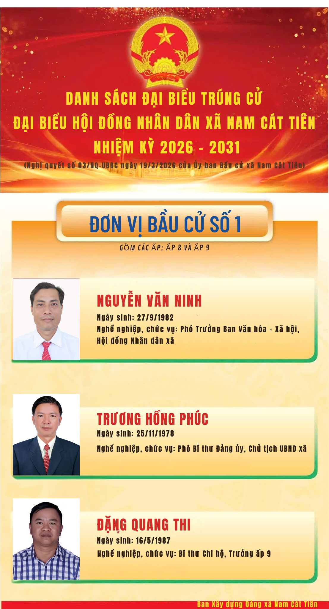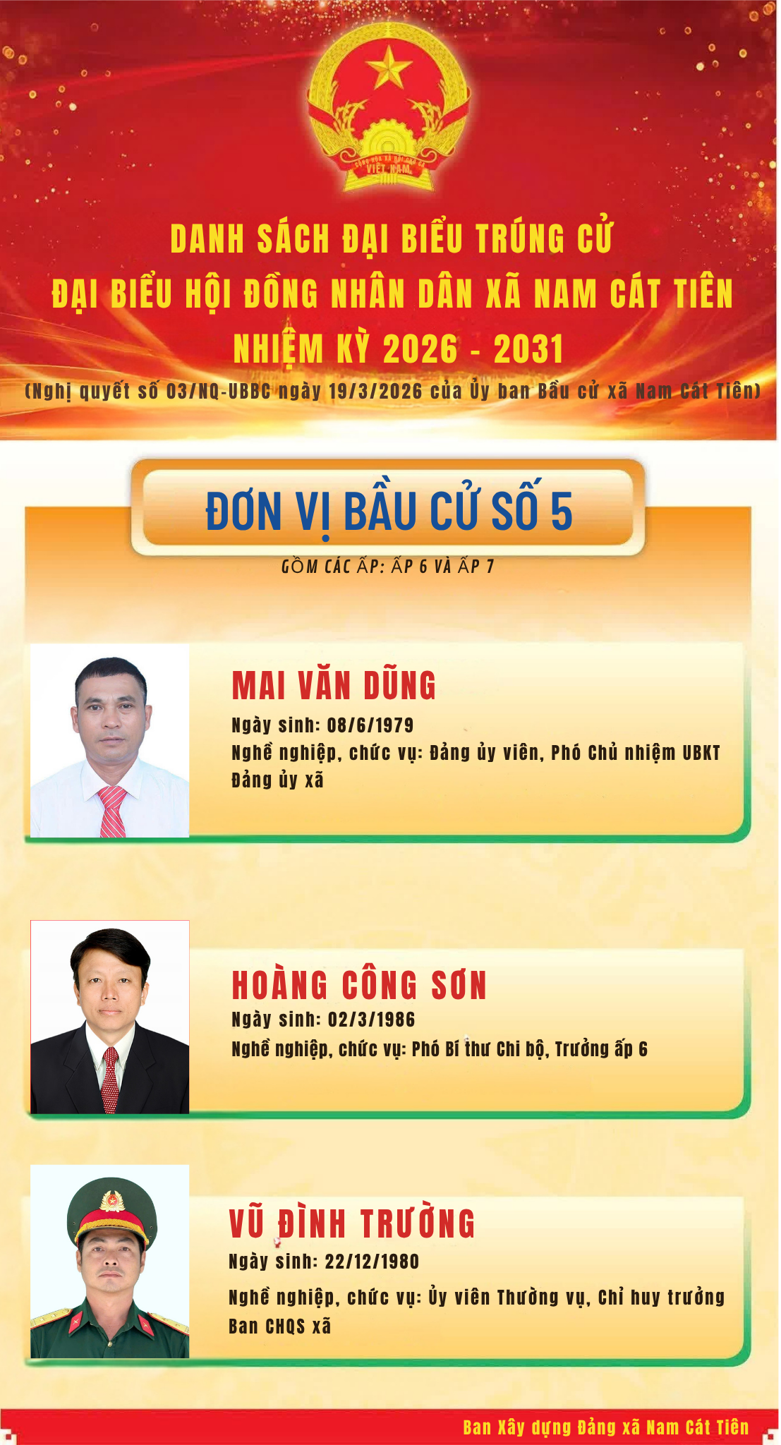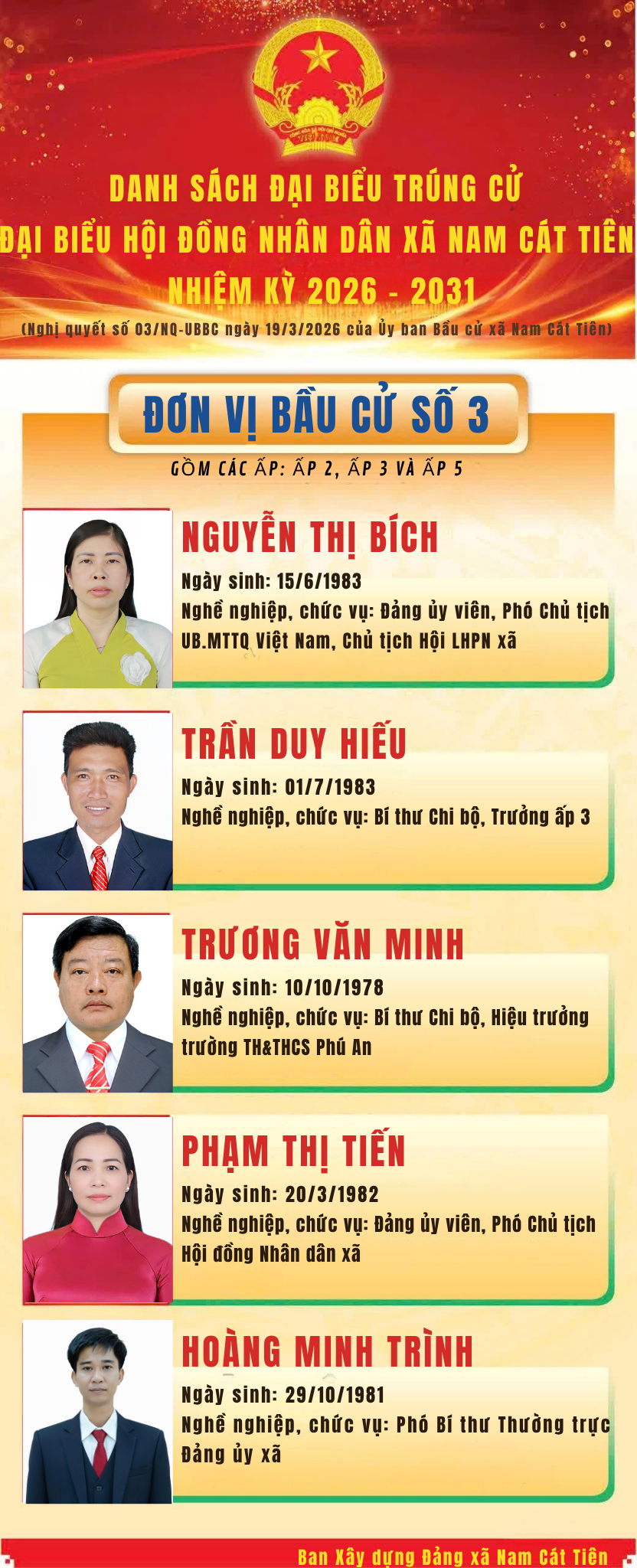 <p style="text-align:justify;">Nghị quyết số 03/NQ-UBBC ngày 19/3/2026 của Ủy ban Bầu cử xã Nam Cát Tiên Công bố kết quả bầu cử và danh sách 17 người trúng cử Đại biểu Hội đồng nhân dân xã Nam Cát Tiên, nhiệm kỳ 2026 – 2031 đã chính thức được công bố. Đây là kết quả của tinh thần dân chủ, đoàn kết, trách nhiệm và sự đồng thuận cao của toàn thể cử tri, Nhân dân trên địa bàn xã trong đợt bầu cử vừa qua.</p><p style="text-align:justify;">Theo báo cáo của Ủy ban bầu cử xã, cuộc bầu cử đại biểu HĐND xã Nam Cát Tiên, nhiệm kỳ 2026 – 2031 diễn ra thành công tốt đẹp, bảo đảm dân chủ, đúng pháp luật và an toàn. Tổng số cử tri trên địa bàn tham gia bỏ phiếu đạt 100% với 10.743/10.743 cử tri đi bầu, thể hiện tinh thần trách nhiệm cao của Nhân dân đối với sự kiện chính trị quan trọng của địa phương. Kết quả kiểm phiếu cho thấy, các đơn vị bầu cử đều đạt tỷ lệ phiếu hợp lệ 100%, không có phiếu không hợp lệ.</p><p style="text-align:justify;">Các đại biểu trúng cử đều là những người tiêu biểu về phẩm chất chính trị, đạo đức, năng lực công tác và tinh thần trách nhiệm, xứng đáng đại diện cho ý chí, nguyện vọng và quyền làm chủ của Nhân dân xã Nam Cát Tiên. Việc công bố kết quả bầu cử không chỉ khẳng định thành công của cuộc bầu cử, mà còn thể hiện niềm tin, sự kỳ vọng của cử tri đối với đội ngũ đại biểu HĐND xã khóa mới.</p><figure class="image"><img style="aspect-ratio:1107/2048;" src="https://namcattien.dongnai.gov.vn/uploads/namcattien/news/2026_03/to-11_1.png" width="1107" height="2048" /></figure><figure class="image"><img style="aspect-ratio:1107/2048;" src="https://namcattien.dongnai.gov.vn/uploads/namcattien/news/2026_03/to-22_1.png" width="1107" height="2048" /></figure><figure class="image"><img style="aspect-ratio:832/2048;" src="https://namcattien.dongnai.gov.vn/uploads/namcattien/news/2026_03/to-3.3.3_2.png" width="832" height="2048" /></figure><figure class="image"><img style="aspect-ratio:1107/2048;" src="https://namcattien.dongnai.gov.vn/uploads/namcattien/news/2026_03/to-44_1.png" width="1107" height="2048" /></figure><figure class="image"><img style="aspect-ratio:1107/2048;" src="https://namcattien.dongnai.gov.vn/uploads/namcattien/news/2026_03/to-3.3_1.png" width="1107" height="2048" /></figure>