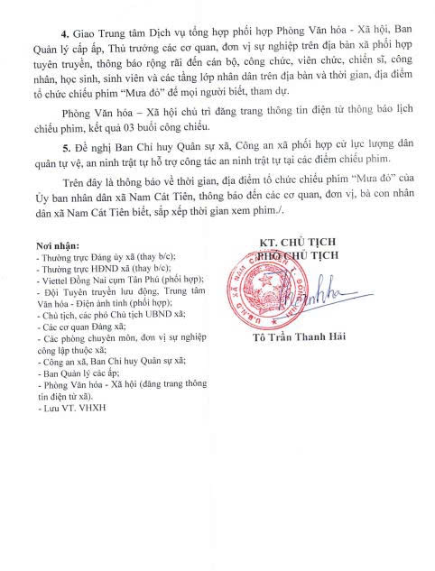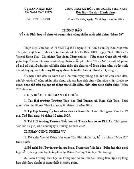 Ủy ban nhân dân xã Nam Cát Tiên trân trọng thông báo đến bà con nhân dân, cán bộ, chiến sĩ, công nhân viên chức, các em học sinh sinh viên, giáo viên và các cơ quan, đoàn thể trên địa bàn xã thông tin về địa điểm, thời gian công chiếu phim “Mưa đỏ" như sau: