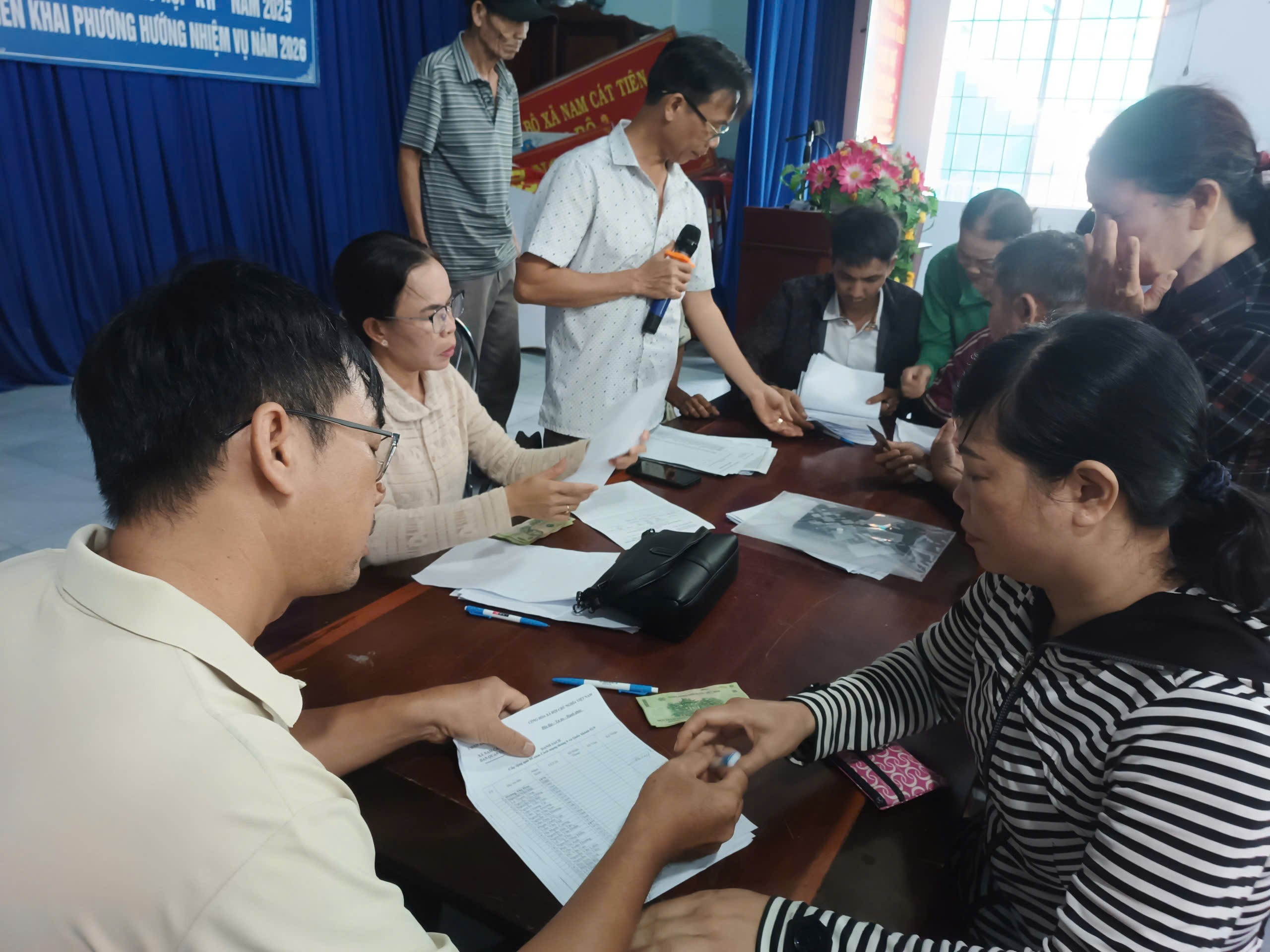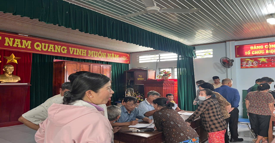 Cán bộ xã Nam Cát Tiên tham gia chi trả quà tặng cho người dân