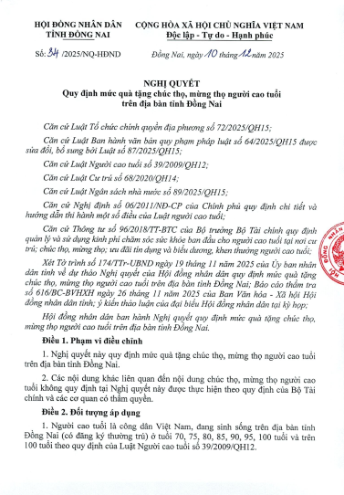 Nghị quyết quy định mức quà tặng chúc thọ, mừng thọ người cao tuổi trên địa bàn tỉnh Đồng Nai