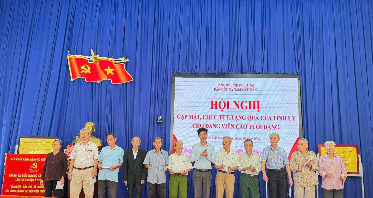 Tại hội nghị, Đảng ủy xã Nam Cát Tiên đã tổ chức trao 101 phần quà Tết tri ân đến các đảng viên có Huy hiệu Đảng từ 40 năm tuổi Đảng trở lên, thể hiện sự quan tâm, chăm lo của Đảng đối với các thế hệ đảng viên lão thành – những người đã có nhiều đóng góp cho sự nghiệp cách mạng của Đảng, của dân tộc và sự phát triển của địa phương.